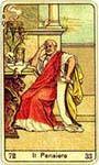 Карта Задумчивость обозначает - размышление. Размышления о чем-то важном и ценном для вас, либо вы получили предложение по работе, либо получили информацию о том, что вам нужно погасить долг. Значения разделены на два направления для одиноких и людей в браке. Финансовые вопросы: признак многих материальных забот и раздумий о долгах и других денежных проблемах, взятых кредитах. Указывает, что, возможно, нет достаточных средств к существованию, чтобы быть довольным жизнью. Романтичные вопросы: есть свидетельство или подозрения в измене, ревность, которая занимает ум человека. Работа: есть дилемма, нерешенность вопроса. Нужно сделать какой-то выбор. Работодатель думает, брать вас на работу, или нет. Собеседование. Большая конкуренция на одно место, экзамены в университет. Неожиданный элемент: кто-то на расстоянии планирует посетить Вас, неожиданно. Романтичные вопросы: недоверие к мужчинам, придирчивость, копание, сомнения в длительных отношениях. Бездействие, комплексы. Вам, вероятно, придется ждать очень долго, прежде чем воссоединиться с кем-то.