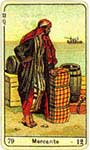 В торговце мы видим человека преклонного возраста, который пользуется уважением и занимает особое положение в обществе, имеет достаток, и возможно свое собственное предприятие. Он символизирует деньги, инстинкт торговца, ловкача, особое чутье на деньги, олицетворяет богатство и изобилие. В карте говорится о том, что все меняется, и эти перемены знаменуют собой прогресс и достаток, и определяет участь баловня судьбы. Однако он может быть слишком зациклен на деньгах и быть не чистым на руку, преследуя свою материальную выгоду. Карта указывает на человека, который определился в этой жизни, уверен в себе, умный и грамотный созидатель своей судьбы. Это может быть муж, покровитель, меценат, юрист, банкир, бухгалтер. В этой карте есть посыл на удачу в сфере бизнеса, увеличение доходов, выгодные инвестиции, брак с богатым человеком, человека с большими полномочиями и ответственностью, зачастую, за свой частный бизнес. Она может указывать на открытого человека, честного, любящего жизнь и душу компании, он может предложить новые возможности для работы и оплачивать ее. Выигрыш, вероятность хорошей прибыли. Добрые намерения прийти, предварительно позвонив по телефону. С негативными картами - Вы связались с очень коварным и не чистым на руку человеком, способным на обман и предательство, результат такой совместной деятельности будет неутешительным. Вы можете ждать от такого человека подвоха и предательства, это кидала, который легко обведет вас на деньги. Они не имеют ни стыда, ни совести.
