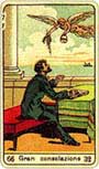 Утешение - интересная карта, в которой образы показывают что то джентльмену, сидящему на красной скамье. Он перестал читать свою книгу и пристально вглядывается вдаль к небу, где парит Ангел Изобилия. На заднем плане Вы можете видеть, один корабль, который изображает желания и тоску. Ангел держит сумку с деньгами и пальмовую ветвь. Чего желает джентльмен и почему он должен быть успокоен? Эта карта заполнена оптимизмом и везде, где она выпадает, она предупреждает окружающие карты что желание исполнится. Книга на столе, могла быть финансовой бухгалтерской книгой, и человек волнуется, что он не может оплатить свои счета. Он просматривал ее и возвращался мысленно к своему прошлому, анализировал, как докатился до такой жизни. Ветвь, похожа на знак, который подает добрую надежду на будущее. Ангел прилетел, чтобы порадовать сердце человека и принести ему то, в чем он нуждается. Он показывает ему, что судьба расправила парус и он в начале пути к своему предназначению, что ситуация изменяется и проясняется. Это карта процесса принятия решения, также и надежда, что все сложится хорошо.
