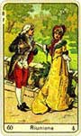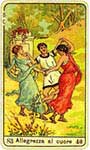 В карте чувство удовлетворенности, от достижения радостного покоя и гармонии с собой и другими людьми. С этой картой приходит улучшение положения, комфорта и защиты от многих проблем. Хоровод - надежда, доверие, удовлетворенность, награды и признание. В карте говорится, что новости полны радости и веселья. Символ приверженности, силы воли, мудрости и уравновешенного поведения. В любви может указывать гармонию, и сложный выбор между двумя партнерами, зачастую равноправными и свободными от связей и брака. Карта говорит в пользу спрашивающего, предсказывает элемент принятия чего - либо (наследства, дара, улучшение экономического и финансового положения, стабилизация эмоциональных отношений, которые поддерживаются в данный момент. Вы можете возобновить и дать шанс старым отношениям, можете вступить в брак или быть приглашенными на свадьбу. Радость в сердце также приносит новые и благоприятные события: дружеские контакты, любовь, планы, идеи для будущих перспектив. Но ничего не дается в этой жизни даром, чтобы реализовать все это, нужно пойти на некоторые жертвы и преодолеть препятствия. Чтобы добиться более существенных результатов в финансовой сфере, лучше не полагаться только на себя и не замыкаться на своих проектах, лучше для вас будет, если будете сотрудничать в команде с другими людьми. Эмоциональное состояние будет зависеть от количества и качества ваших друзей способных оказать вам моральную поддержку, при этом вы сами не должны оставаться черствыми и невнимательными к другим. протяните руку помощи своим друзьям. С неблагоприятными картами, может указывать, на плохие жилищные условия, когда куча родственников ютится в маленькой хрущевской квартире, или же приехавшие родственники, которые загостились у вас уж слишком долго, создавая неудобства и проблемы, вмешательство друзей и родственников в вашу личную жизнь. Рекомендуется принять меры, и поговорить открыто с ними. Вы чересчур сентиментальны, ранимы, эмоционально нестабильны, глаза постоянно на мокром месте. Усталость, дисгармония между разумом и чувствами, неумение брать на себя обязательства и принимать решения, излишняя уступчивость, приспособляемость. Поездки и планы откладываются при выпадении еще одной позитивной карты рядом, указывает, что трудности будут преодолены ценой больших усилий и жертв с вашей стороны.