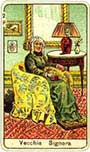 Пожилая дама, изображенная на этой карте, выглядит замечательно, аккуратная, в строгом чепце, благородный взгляд, можно определить, что это бабушка, мать, тетя или просто знакомая, женщина, однако пожилая и ласкова к спрашивающему. Присутствие книг, цветов и вазы могут быть предзнаменованием счастья, заслуженных почестей и неожиданных визитов. В сочетании с позитивными картами может представлять лояльность и верность, в сочетании с негативными картами, однако, является синонимом враждебности, неверности, ворчливости, дряхлости и сомнительных ситуаций. Это синонимом дуализма. Период сопряжен с препятствиями и конфликтами. Старая дама может также представлять старые проекты, которые приносят пользу только кратковременно, маленький доход, любовные страдания и томления, основанные на проблемах интимной сфере, охлаждении отношений, желание близости, но невозможности ее иметь. В комбинации с отрицательными картами, может обозначать семейную вражду, вендетту, когда родственники воюют, или не разговаривают друг с другом длительное время. Старые друзья, которые внезапно стали врагами и теперь приносят неприятности. Это все обусловлено внешними воздействиями, или вас со старым другом поссорил кто-то третий, бессовестно вклинился. Может указывать на наличие ложных друзей, ворчливый несговорчивый характер Возможно причина конфликта деньги, общие интересы, когда на каком-то этапе деловые партнеры расходятся и между ними возникают разногласия из-за денег, или дележа имущества. Раздор между родственниками из-за наследства.