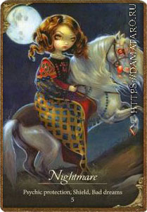 Оракул говорит: Иногда мы наиболее уязвимыми, когда мы спим, или, когда мы пытаемся спать. Эта карта говорит о ночи, которая является беспокойством души, которая не может найти пространство, в котором можно закрыть глаза и полностью расслабиться, чьи мечты создают наслаждения и страдания, и которая чувствует ужас, когда наступает тьма, а не радость ночи. Ночь может быть местом террора для многих, здесь происходят повторы, ведутся старые войны, вновь вскрываются глубокие раны и предательства прошлого, как свежие, как будто это имело место в этот день. Ибо в фантастическом ландшафте нет времени, как мы его знаем, когда мы бодрствуем, мы на милости сознания и этой энергии, и все призраки мира ничто для проклятия сумерек. Если это происходит у вас или у другого, о ком вы заботитесь, теперь есть способ чтобы помочь вам. Этой ночью кобыла и всадница могут вести ваши мечты. Она бесстрашна и бесстрашен ее конь, они будут патрулировать ваши границы и ваши сны. Они позволят вам увидеть более нежные истины вашей жизни, чтобы напомнить, как вы мечтаете, и медленно, с течением времени, ночь не будет наводить такой ужас для вас. Ваши мечты станут более безопасным местом, в которое вы можете погружаться каждую ночь и обновляться. Есть духи, которые патрулируют, которые охотятся, и они могут украсть энергию многих, особенно тех, чья энергия является яркой, открытой и невинной, и тех, кто ослаблены болезнью, стрессом или другим дисбалансом. Маре и ее конь защитят вас от этих духов. Они никогда не повредят тем, кого они охраняют, они слишком известны, слишком опытны, слишком мощно преданы своей цели и они будут обеспечивать, чтобы ни хромой призрак, ни голодный обитатель ночи не могли украсть вашу энергию через трещины в вашей ауре, и пожинать энергичные плоды кормления у вас. Мечты становятся красотой. Сон становится миром. Ночь приветствуется, и ужасы прошлого исчезнут, когда она едет вперед, чтобы охранять ваш сон.