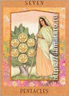 Женщина склонилась к дереву, пропалывая между его корнями и обрезая ветви. Она ждет созревания плодов, символизируемых семью пентаклями.
