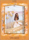 Женщина плывет в лодке в лучшее место. Она собрала шесть мечей, чтобы взять их с собой, они символизируют новую ясность и мудрость, которой она обладает, которые будут использоваться в новой жизни.