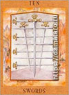 Десять мечей вплетены напротив облачного серого неба, символизирующего способность преобразовать трудные ситуации в мудрость и действие.
