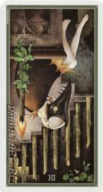 Пойманный в ловушку в подземном лабиринте, парень в маске ищет выход. Отдыхая на выступе, он решает сдаться в кажущейся ему безвыходной ситуации. Восемь жезлов обозначают дорожку к возможному выходу из лабиринта. Девятый жезл зажегся вместе с решением не сдаваться.