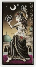 Прекрасная танцовщица дает представление под растущей луной, жонглируя двумя серебряными пентаклями. Несмотря на то, что ее движения кажутся очень легкими, они являются результатом огромного труда и сосредоточенности.