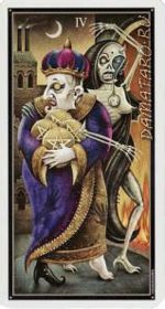 Этот скряга не готов к своей смерти. Демон сопровождает его на пути в ревущее пламя ада. Оглядываясь назад, на весь свой жизненный путь, он ухватился за четыре пентакля в попытке сохранить свое мирское имущество.