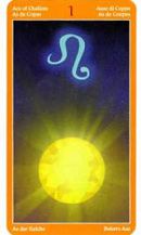 Взгляд в прошлое:1. Туз Пентаклей. Знаки зодиакальных созвездий Огня (тригон: Овен, Лев, Стрелец) и три саламандры — элементали огня.