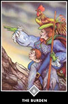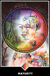 Эта карта изображает эволюцию сознания. описанную Фридрихом Ницше в книге Так говорил Заратустра. Он говорил о трех уровнях: Верблюд. Лев и Ребенок. Верблюд - сонный, скучный. самодовольный. Он живет в заблуждении. думая, что он - вершина горы, но на самом деле он настолько озабочен мнениями других. что едва ли обладает своей собственной энергией. Из верблюда возникает лев. Когда мы понимаем, что упускали жизнь, мы начинаем говорить нет требованиям других. Мы уходим от толпы, одинокие и гордые, провозглашая свою истину. Но это не конец. В конце концов возникает ребенок, ни покорный, ни мятежный, а невинный. спонтанный и правдивый в своем существе. В каком бы пространстве вы сейчас не были - сонные и угнетенные или рычащие и мятежные - осознайте. что. если вы позволите. это разовьется в нечто новое. Настало время роста и перемены.