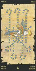 Борьба с ветряными мельницами. Человек, действия которого символизированы перевернутой Семеркой Скипетров, подобен Дон Кихоту, посвящающему свою жизнь сражению с призрачными химерами своего нездорового воображения. Повсюду он видит несуществующих врагов и недоброжелателей Весь мир наполнен враждебными призраками эта карта символизирует некое параноидное состояние, когда человек шарахается даже от собственной тени. Охота на ведьм. Энергия и силы расходуются впустую.