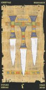В перевернутом положении у Тройки Мечей появляются оптимистические нотки. Переживаний все равно не избежать, но они будут переноситься легче. Появится возможность отстраненно, как бы со стороны, наблюдать за происходящими событиями, не погружаясь глубоко в эмоции. Философский взгляд на проблему: «В жизни всему уделяется место - рядом с добром уживается зло. Если к другому уходит невеста, еще неизвестно, кому повезло.»