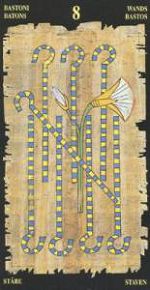 Восьмерка Скипетров - это воплощение Закона, причем закона социального. Она также символизирует науку, обучение и любую передачу знаний. «Моральная устойчивость, политическая грамотность». Способность войти в определенный круг, снискать уважение. Умение принять чужие правила игры. Эта карта может сигнализировать о необходимости быстро принять конкретное решение. Причем от того, какое решение Вы примете, будет зависеть очень многое. Восьмерка Скипетров не является сильной картой, и чаще всего она указывает на короткий промежуток времени или быстро преодолеваемое препятствие. В некоторых случаях это может быть быстро доставленное сообщение или письмо.