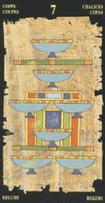 Семерка Кубков указывает на такой этап жизненного пути, когда уже многое достигнуто, создана определенная база, и теперь человек стоит перед выбором, в каком направлении и с кем ему развиваться дальше. Это похоже на состояние молодого специалиста, успешно окончившего престижный вуз и выбирающего себе дальнейшее место работы из нескольких предлагаемых вакансий. От сделанного сейчас выбора зависит дальнейшее развитие дела. Этот выбор необходимо делать, исходя из собственных ощущений, представлений о чести и порядочности. В моменты, когда появляется Семерка Кубков, необходимо быть предельно честным самому с собой, не идти на сделки с совестью.