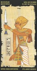 Владыка Мечей символизирует целеустремленного мужчину, который самоутверждается во внутренних и внешних битвах. Этот сильный и энергичный человек, подчас излишне жесткий и прямой, обычно больше полагается на себя, нежели на других. Владыка проявляет незаурядную физическую силу и строгость, требовательность как к себе, так и к окружающим его людям. Иногда он может навязывать строгие правила, а при их невыполнении наказывать провинившегося. Но сам является образцом законопослушности и честности. Владыка Мечей строгий, но справедливый. Это человек действия, который кипит от переполняющей его энергии, личность героического склада. Даже размахивая лопатой на собственном огороде, борясь с нашествием сорняков в саду, он будет это делать с той же решительной силой, с которой в прошлые века размахивал своим безжалостным мечом перед вражескими рядами. Ему известен лишь один способ делать что-либо - с жаром. Влиятельный авторитет; тот, кто здесь командует, лидер. Он также может представлять судебного исполнителя, судью, адвоката, кадрового офицера или командира. Владыка Мечей умеет легко наживать себе опасных противников и завистливых соперников. Его сильнейшие качества, помогающие в борьбе - самообладание, сила, жизненная энергия, превосходные знания, изящность, интеллектуальная доблесть. Недостаток Владыки - склонность перегибать палку.