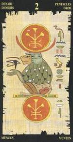 Двойка Пентаклей является очень обыденной и суетной картой. Она указывает на необходимость ежедневной кропотливой деятельности, связанной с поездками (служебные командировки на соседнее предприятие), письмами, служебными документами, официальными бумагами. Мелкие суммы денег. Вместе с тем и прилив сил, способность профессионально и аккуратно выполнить эту работу. Организаторские способности, ловкость, коммерческая изворотливость. Умение вовремя распознать, откуда дует ветер. Удачливый коммерсант, коммивояжер, дистрибьютер.