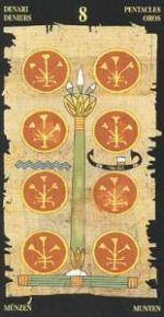 Восьмерка Пентаклей символизирует осторожность, осмотрительность, умение замечать и понимать детали. Хорошее чувствование ситуации, законов игры, умение принять правила, оставаясь самим собой. Герой этой карты - разведчик Штирлиц. Точность, скрупулезность, любовь к деталям. Спокойная, методичная, ответственная, продолжительная работа. Восьмерка Пентаклей символизирует также закон, логику, расчетливость, умение быстро принимать решения, профессионализм. В складывающейся ситуации подвергнется проверке терпение, потребуется умение выждать, не поддаться эмоциям и не сорваться. Аскетизм, дисциплина, самоконтроль, хорошо скрываемые амбиции.
