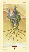 Восьмерка – это цифра не только власти, но и ограничения, потому что она обозначает основание и структуру. Перевернутая Восьмерка Жезлов показывает, что энергия ограничена в результате крушения, всякого рода ошибок и задержки движения. Конкретно это выражается в транспортных проблемах, причиной которых могут быть забастовки, аварии и споры. В области идей карта означает скороспелые решения, приводящие к дальнейшим ограничениям, и советует не подписывать документы, не писать писем и не давать обязательств.