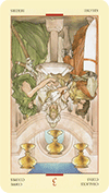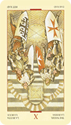 Перевернутая Десятка Кубков обозначает потери и разрыв в эмоциональной сфере, Взаимоотношения – это главное, но все, к чему Вы привязаны, может подвергнуться потрясениям и изменениям. Период ссор или несогласия не всегда означает потерю любви. Как всегда, эта карта должна читаться в контексте.