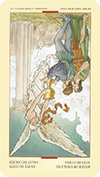 Перевернутый Паж Кубков нырнул в воды бессознательного. Он олицетворяет эмоциональное смятение, духовные иллюзии и неспособность к взаимопониманию. Похоже, что все покрыто туманом и все формы размыты. Это толкование может относиться к настроению, превалирующей атмосфере любви, ситуации на работе или описывать душевное состояние.