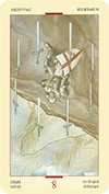 Перевернутая Семерка Жезлов предостерегает от страха и колебаний. Эти эмоции часто скрываются под маской условного отношения к жизни: "когда я смогу это себе позволить. . . ", "когда у меня будет время", "когда я обзаведусь семьей", "когда я разведусь" и т. д. Перевернутая Семерка Жезлов напоминает нам, что это воображаемое время может никогда не наступить и что именно страх сдерживает нас. Потеря возможности, растрата таланта, отказ исследовать альтернативные пути – все это может обозначать перевернутая Семерка Жезлов.