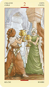 Положение Двойки Кубков крайне важно для ее правильного толкования. В ее основе лежит идея творческого союза, которая часто может применяться к отношениям, где смешиваются художественная и духовная энергии. Плодотворные рабочие отношения всех типов находятся под покровительством этой карты – близкая дружба в деловой жизни, продуктивные и веселые команды, директор и актер, художник и муза, – любой союз, в котором позитивные отношения между личностями рождают энергию. И если ни работа, ни любовь не кажутся подходящим толкованием, вспомните о дружбе и радости участия в общественной жизни.