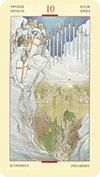Несчастье, неизбежность, слезы, опустошенность, бессилие, разрушение, сокрушительный удар.Десятка Мечей является блеклой картой, предполагающей разрушения и предательство. Это традиционно проявляется в злословии, клевете, обмане, хищении или предумышленных компаниях, проводимых, чтобы дискредитировать личность или предприятие. Как Десятка, она также указывает на конец продолжительного состояния – взаимоотношений, бизнеса, договоренностей в сфере карьеры или финансов, так как все Десятки обозначают трансцендентность какого-то рода, и эта карта не настолько страшна, как на первый взгляд может показаться. Она действительно обозначает нестареющую поговорку: "Темнее всего бывает перед рассветом".