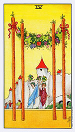Четверка Посохов Четверка Жезлов соответствует периоду мира и покоя, во время которого мы раскрываемся навстречу жизни и ее радостям. Мы уверены в собственной безопасности, а поэтому готовы покинуть ”крепостные стены” и выйти во внешний мир. Это означает общение, развлечение, удовольствие и радость жизни, а также раскрытие нашего ”Я” ей навстречу, ощущение глубокой взаимосвязи с другими людьми.