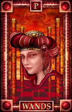 Описание человека: В глазах у Пажа Посохов озорной блеск. Пол из квадратов и четыре колонны намекают то ли на сцену, то ли на шахматную доску, намекая, что ей по вкусу драма, будь она зрительницей или подстрекательницей. Она легко погружается в скуку, и любит мутить воду, где только можно. Она смотрит так, словно только что затеяла невероятный заговор, который, без сомнения, изрядно ее позабавит.