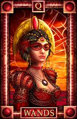 Описание человека: У Королевы Посохов сильная личность. На рисунке она выглядит, как актриса, позирующая фотографу. С ее гордой харизматичной манерой и пристальным взглядом она бросает нам вызов – сможем ли мы вложить все, что у нас есть, в избранное нами дело. Ее одежды из красного шелка, красные украшения, золотой головной убор и повторяющийся мотив золота – стихии огня – производят сильное впечатление, но у нее есть та аристократическая стать, которая нужна, чтоб носить их. Маска намекает на то, что за этим всем известным лицом, она прячет частицу себя, которую никому не показывает. Актерская жизнь нелегка, он требует решимости и собранности, качеств, которые необходимы, если мы хотим довести свой проект до завершения.