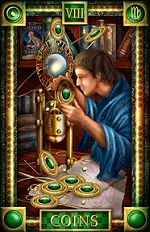 Описание человека: Паж Монет – это молодая женщина, с любопытством глядящая на мир. У нее еще не слишком много практического опыта общения с миром, но она жаждет узнать, что поможет ей подготовиться к будущим завоеваниям. Она еще не гуляла по зеленому лугу, изображенному на карте, пока что она приглядывается к нему издалека. Две колонны за ней символизируют знание, которое пока что существует как абстрактные понятия. Серьезное выражение ее лица, ее холодный спокойный взгляд говорят о профессионализме и ответственности по отношению к ее учебе и об аналитическом подходе к миру, свойственному ученым.