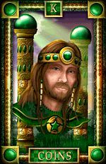 Описание человека: Король Монет является как вождь племени, на его лице следы долгих лет, проведенных в работе и борьбе с материальным окружением ради пользы его племени. Две колонны позади Пажа, представляющие абстрактное знание, находятся куда ближе к Королю, теперь они стали мудростью, дарованной опытом. Король руководствуется этим опытом, на что указывает путеводный свет, который сияет с вершины левой башни. Король может быть купцом или бизнесменом, умеющим с учетом своего долгого опыта создавать безопасное окружение. Его интуитивное понимание циклов роста позволяет ему терпимо относиться к чужим слабостям и ко взлетам и падениям в коммерции. Короли – это зрелые и решительные личности. Королю Монет приходится порой принимать нелегкие решения, он склонен порой просто отрубить ту ветвь, над которой трудилась Королева Монет, чтобы изменить направление ее роста.