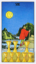 Восьмерка Кубков Восьмёрка Кубков — это одна из трёх карт ”прорыва”, обозначающая печальное прощание (наряду с Колесницей, означающей радостное ”выступление героя” на поле битвы, и Шестёркой Мечей, символизирующей поход в неизвестное, к новым берегам). Она показывает, что мы должны покинуть привычное окружение, расстаться с людьми или вещами, к которым ”прикипели сердцем”, и отправиться в далёкий путь, в неведомое будущее. В любом случае она свидетельствует, что нас не изгнали, это мы сами, по своей воле решили уйти (другое дело, что у нас могло не быть иного выхода). ”Тяжесть прощания” заключается в двух моментах: мы должны покинуть то, что нам дорого, и не знаем, что нас ожидает.